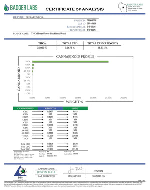 All BackWoodz premium hemp flower products go through 3rd party testing and organically grown without the use of pesticides. Blackberry Skunk tests with 25.02% THCA and under .3% Delta-9 THC. BackWoodz hemp flower is U.S Farm Bill compliant under the Agriculture Improvement Act (Sec. 10113).