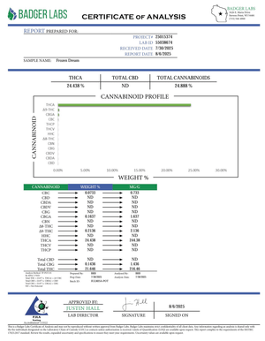 All BackWoodz premium hemp flower products go through 3rd party testing and organically grown without the use of pesticides. Frozen Dream tests with 24.43% THCA and under 0.3% Delta-9 THC. BackWoodz hemp flower is U.S Farm Bill compliant under the Agriculture Improvement Act (Sec. 10113).
