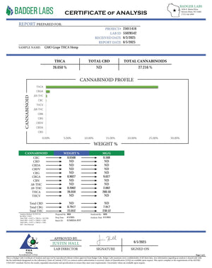 All BackWoodz premium hemp flower products go through 3rd party testing and organically grown without the use of pesticides. GMO Grape tests with 26.05% THCA and is under .3% Delta-9 THC. BackWoodz hemp flower is U.S Farm Bill compliant under the Agriculture Improvement Act (Sec. 10113).