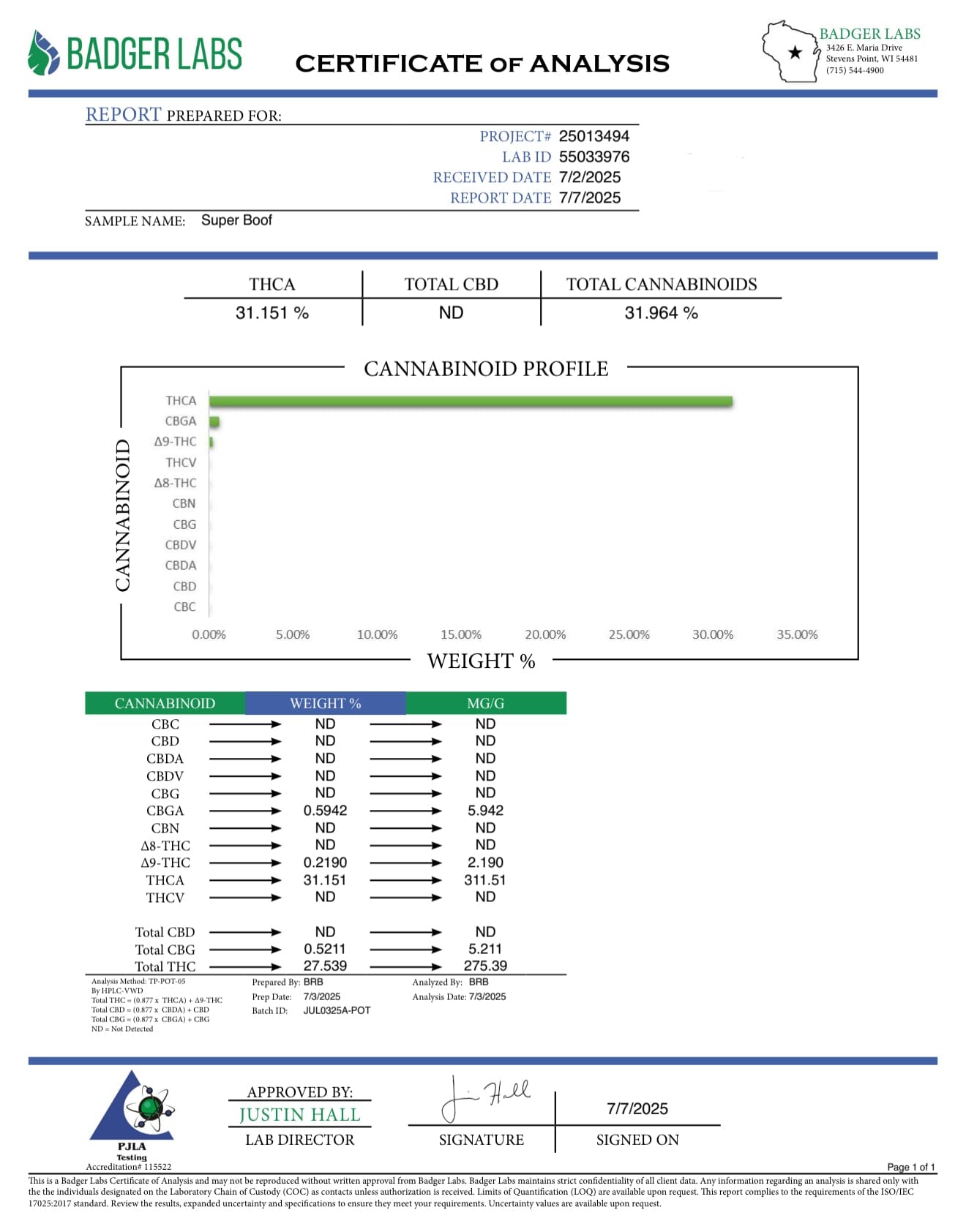 FRESH RESTOCK! Super Boof is an exotic cultivar with a dense structure. It has an aroma of juicy cherries and rich earth. These buds have a tasty flavor profile of herbs, berries and sweet fruit. This strain is a 50/50 hybrid and is good for both day or evening use. Super Boof provides extreme cerebral effects with full body relaxation. THC-A is a natural cannabinoid found in hemp flower. No conversion or infusion method is used in this product.