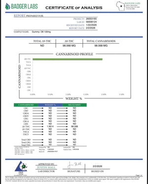 Ingredients: Organic Tapioca Syrup, Organic Cane Sugar, Fruit Pectin, Organic Flavor Extract, Potassium Citrate, Citric Acid, Natural Vegetable Extracts (Coloring), Hemp Derived D8 Distillate.