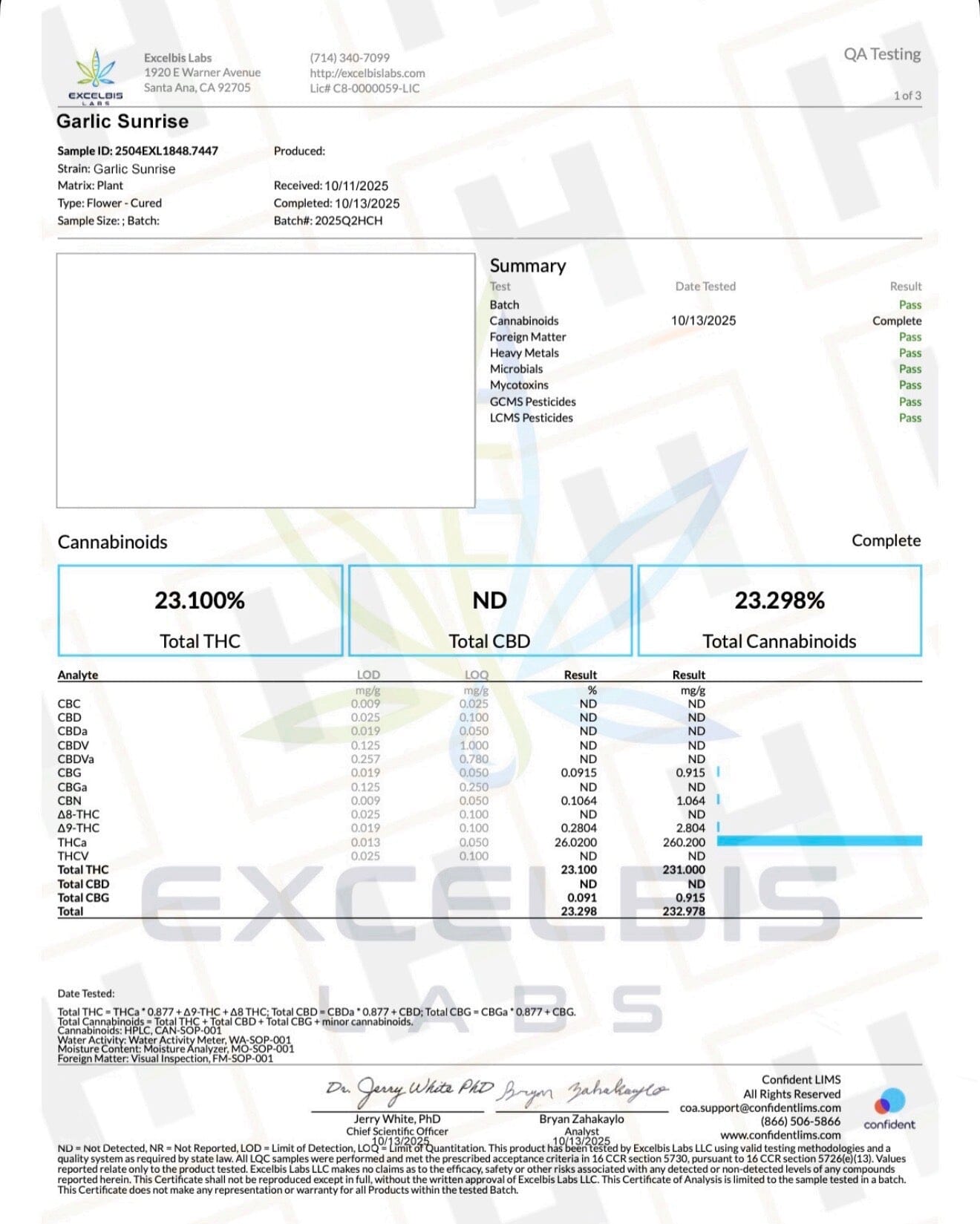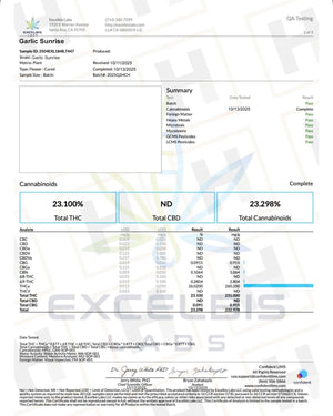 All BackWoodz premium hemp flower products go through 3rd party testing and organically grown without the use of pesticides. Garlic Sunrise tests with 26.02% THCA and is under .3% Delta-9 THC. BackWoodz hemp flower is U.S Farm Bill compliant under the Agriculture Improvement Act (Sec. 10113).
